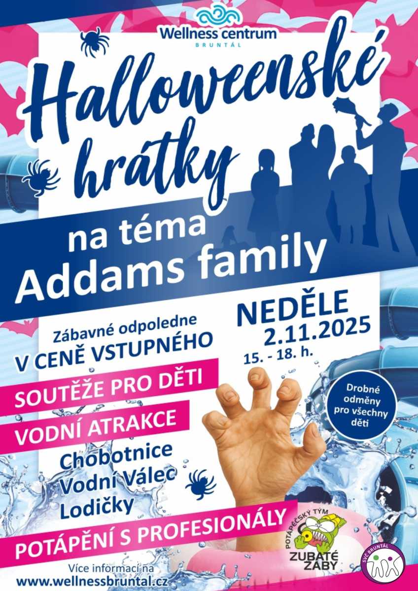 BRUNTÁL | Vodní válec, nafukovací chobotnice, lodičky i potápění s profesionály – to vše čeká na děti během halloweenského odpoledne plného soutěží, her a legrace. Přijďte si užít strašidelnou atmosféru ve stylu Addamsovy rodiny a nechte se vtáhnout do vodního světa plného překvapení!