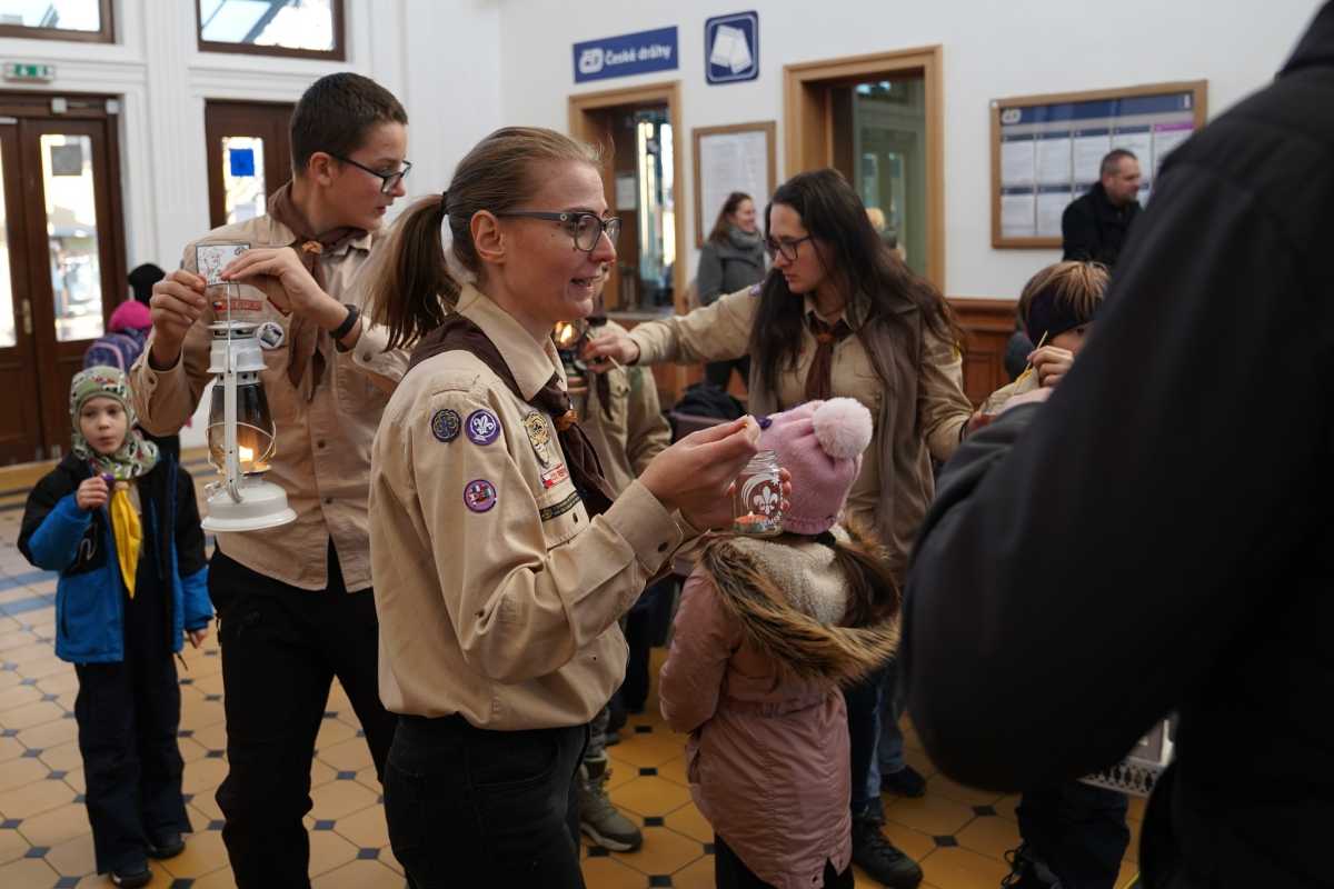 BRUNTÁL | Dnes dopoledne přivezli skauti z Čechovic vlakem do Bruntálu Betlémské světlo. Na nádraží jej předali skautům z Rýmařova, kteří plamínek rozdělili do dalších lucerniček. Zájemci si mohou světlo – symbol míru, lásky, naděje a přátelství – převzít v kostele Nanebevzetí Panny Marie na Žižkově náměstí.