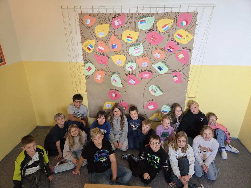 Na závěr jsme společně vytvořili „Strom jazyků“, který znázorňuje názvy evropských zemí, jejich vlajky a typické pozdravy jednotlivých států.