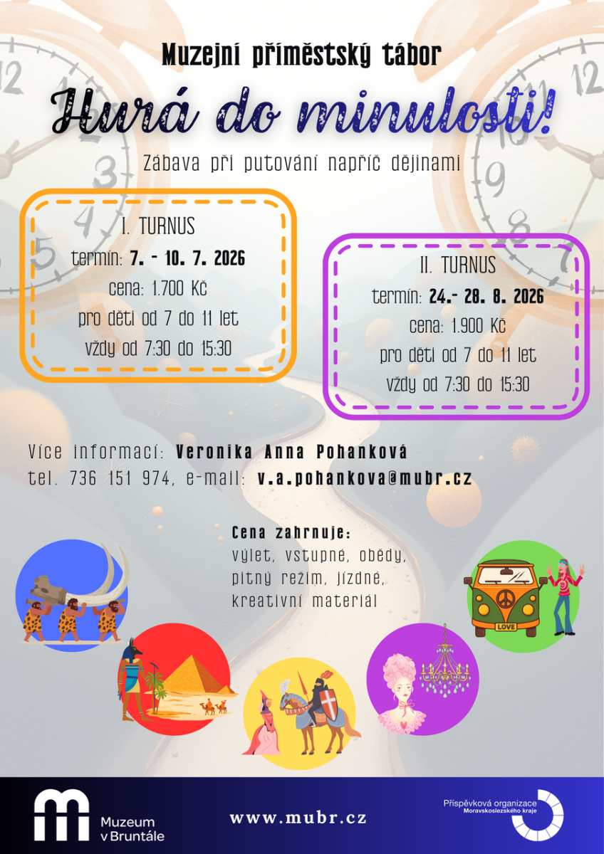 První turnus proběhne od 7. do 10. července 2026 (z důvodu státního svátku došlo ke zkrácení doby tábora o jeden den oproti informaci inzerované v našem zpravodaji Muzejní trojlístek) a druhý turnus od 24. do 28. srpna 2026, každý den vždy od 7:30 do 15:30.
