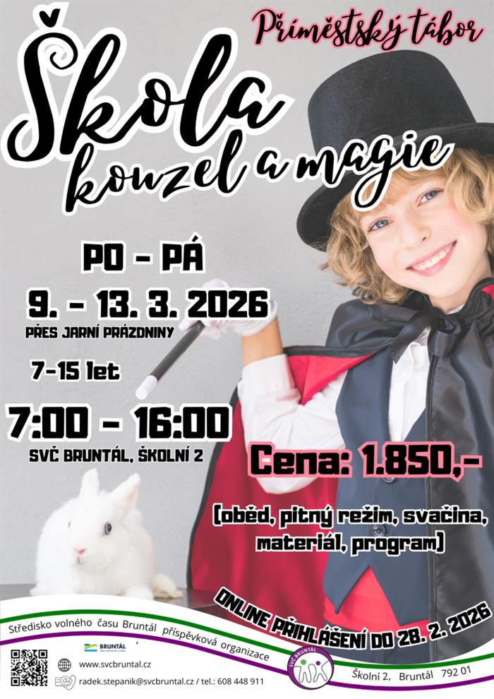BRUNTÁL | Během jarních prázdnin se děti promění v malé kouzelníky a čarodějky, kteří projdou výcvikem v tajemné škole plné čar, lektvarů a kouzelnických výzev. Čeká je výroba kouzelných předmětů, učení kouzelnických triků, týmové hry a mnoho další zábavy. Fantazie, smích a dobrodružství jsou povinnou výbavou – kouzelnická hůlka výhodou!