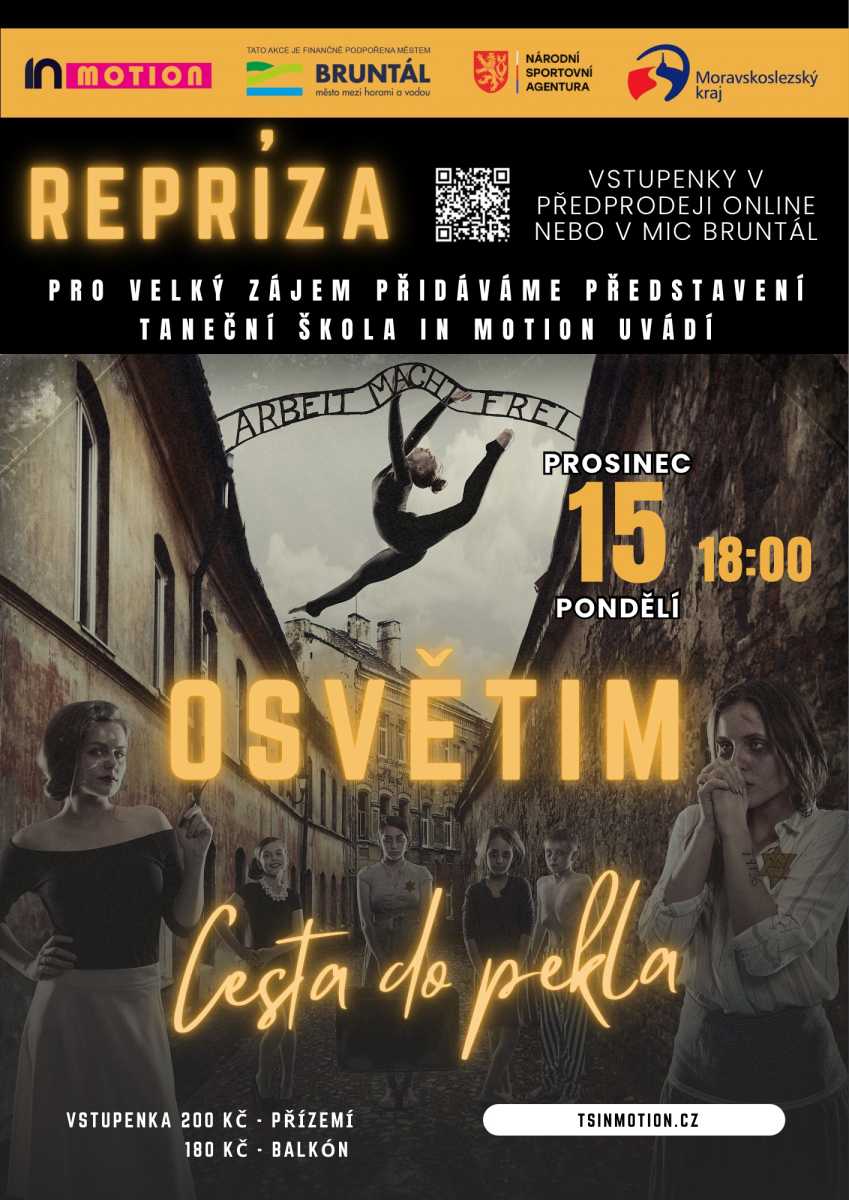BRUNTÁL | Taneční skupina In Motion uvede 15. prosince 2025 v Městském divadle v Bruntále reprízu silného a emotivního představení Osvětim: Cesta do pekla. Působivý tanec, strhující příběh a hluboké poselství slibují jedinečný zážitek, který zasáhne každého diváka.