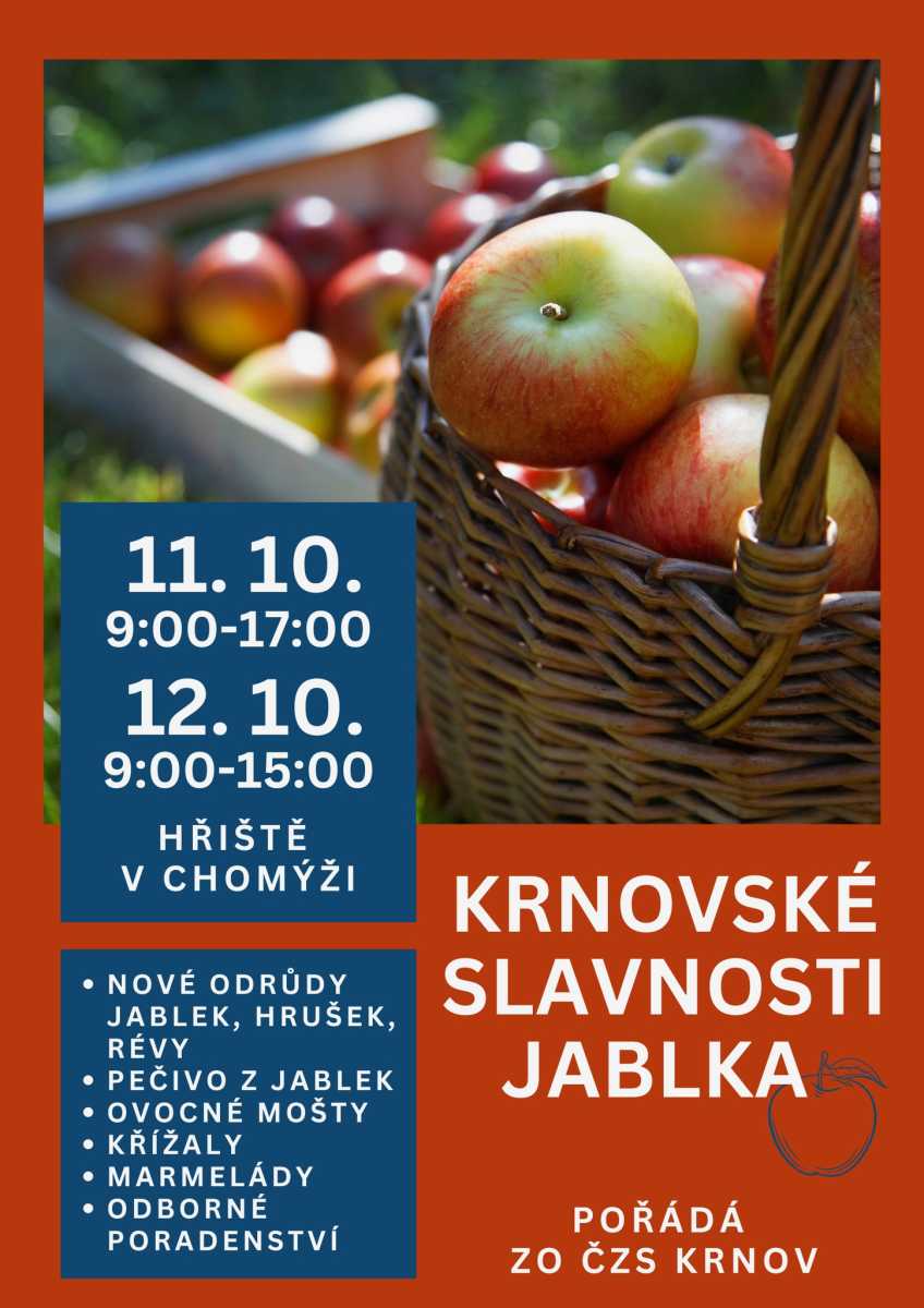KRNOVSKO | Už tento víkend ožije fotbalové hřiště v Chomýži vůní jablek, hrušek a domácích dobrot. Krnovské slavnosti jablka nabídnou pestrou přehlídku odrůd, ovocné mošty, marmelády i pečivo s jablky. Na místě budou i odborníci, kteří se rádi podělí o rady k pěstování a zpracování ovoce.
