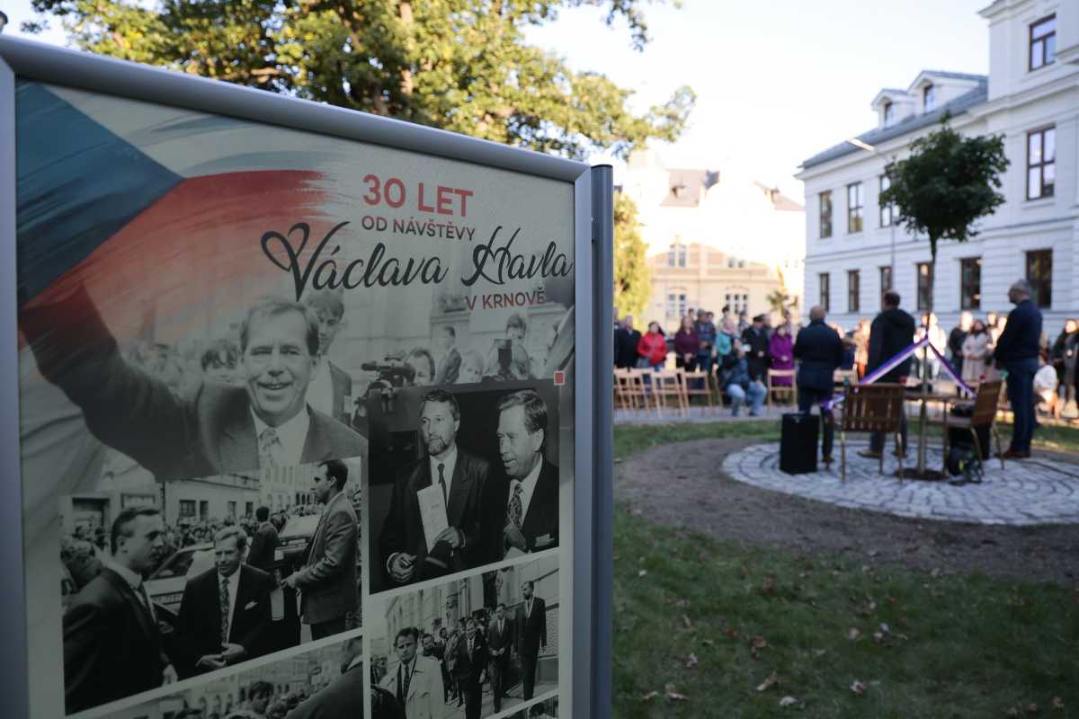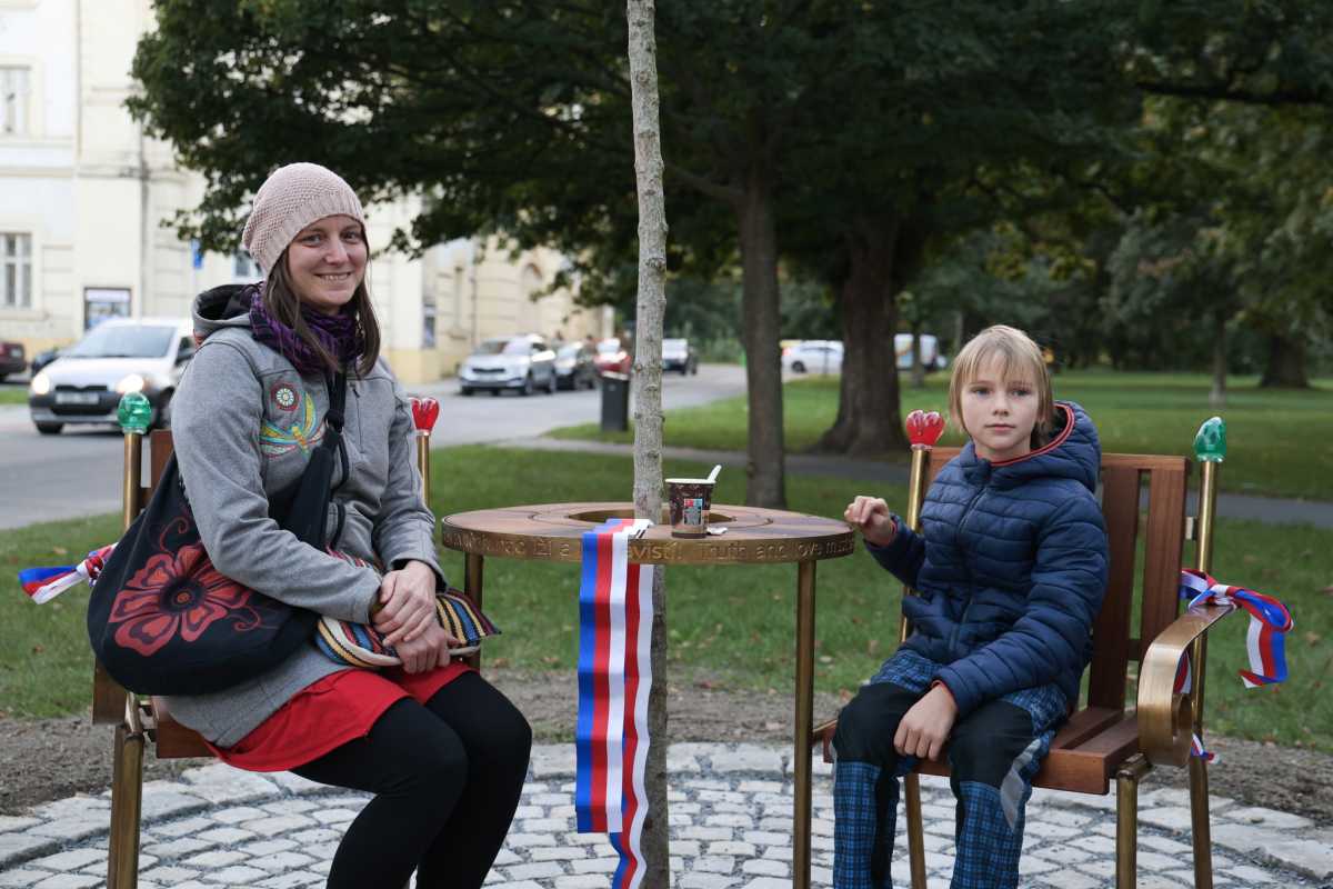 KRNOV |  Před základní uměleckou školou na náměstí Míru bylo dnes slavnostně odhaleno pamětní místo věnované Václavu Havlovi, které má podobu dvojice křesel spojených kulatým stolem, jehož středem prorůstá kmen stromu.
