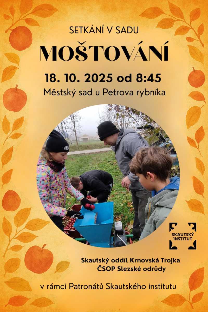 KRNOV | Skautský oddíl Krnovská Trojka zve veřejnost na podzimní setkání v městském sadu u Petrova rybníka. Akce se koná v sobotu 18. října od 8.45 hodin u Papírového mlýna. Součástí programu bude moštování jablek a opékání špekáčků.