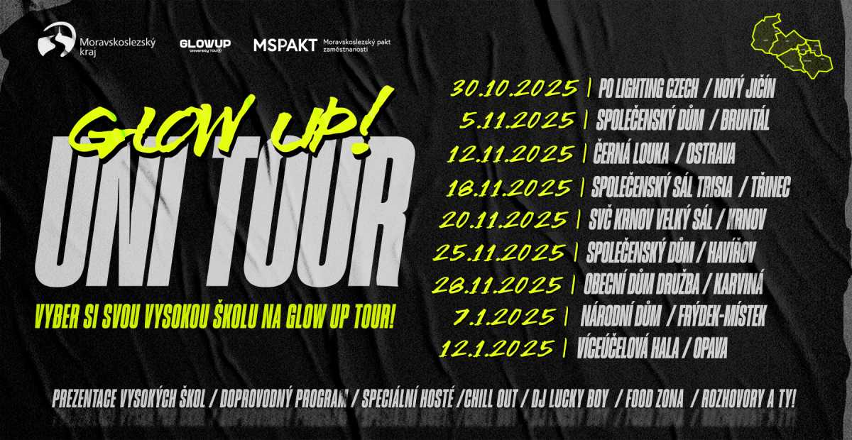 Glow Up UNIVERSITY TOUR je určena žákům posledních ročníků středních škol, kteří zvažují přihlášku na vysokou školu. Všechny akce probíhají v dopoledních hodinách, a jsou zdarma. „Kromě prezentací univerzit, kariérových poradců a odborníků z praxe tvoří důležitou část programu i mladí úspěšní lidé z regionu. Podělí se o své příběhy, aby ukázali, že za zajímavou kariérou není nutné jezdit jinam. Programem provází influencer Lukáš Souhrada, který středoškoláky moderní formou oslovuje na sociálních sítích coby DJ Lucky Boy,“ řekl hejtman Moravskoslezského kraje Josef Bělica a upřesnil, že mezi řečníky z řad mladých bude například lékař Martin Palička, odborník na AI Dalibor Mráz nebo úspěšná influencerka a moderátorka Vindy Krejčí.