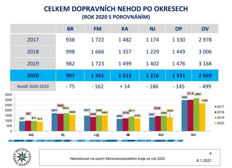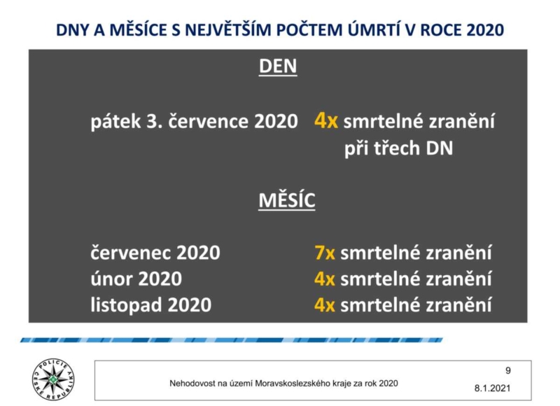 V Moravskoslezském kraji celkem došlo za rok 2020 k 9 197 nehodám, což je o 1 053 méně než v roce předchozím. Nejvíce osob zemřelo na našich silnicích v červenci, a to sedm osob, v únoru a listopadu čtyři osoby. „Hlavní příčinou dopravních nehod stále zůstává způsob jízdy, následují nedání přednosti v jízdě a nepřiměřená rychlost,“ informovala mluvčí moravskoslezské policie Pavla Jiroušková.