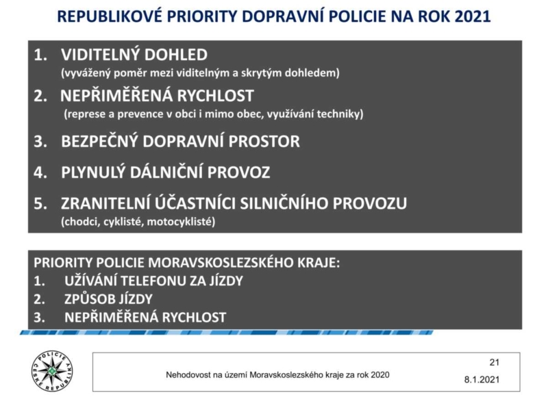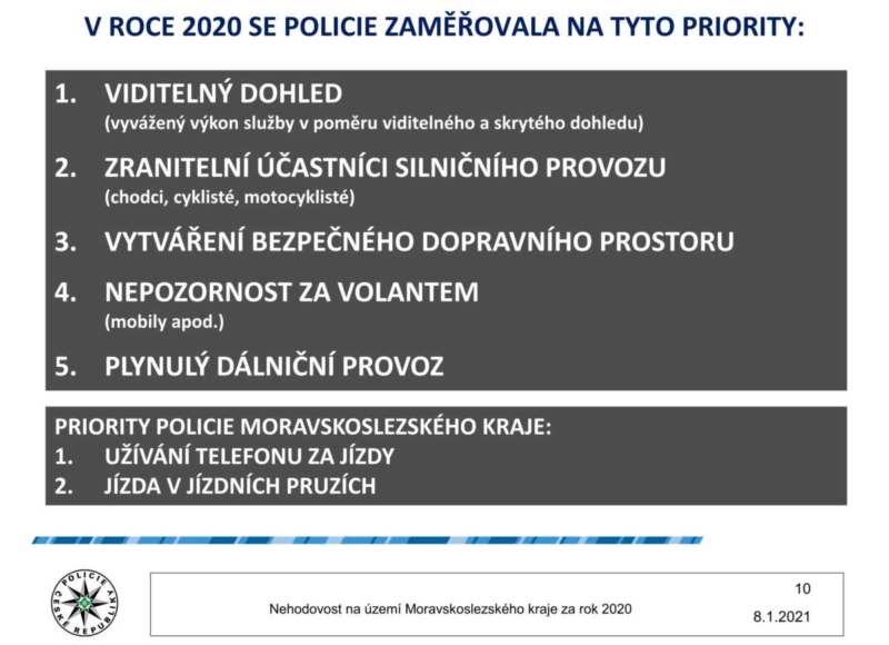 „Dopravní policisté Krajského ředitelství policie Moravskoslezského kraje se budou zaměřovat letošní rok nejen na priority celorepublikové, ale budou pokračovat také v nastavených prioritách našeho kraje, kterými jsou užívání telefonu za jízdy, způsob jízdy a nepřiměřená rychlost,“ uzavřela mluvčí moravskoslezské policie Pavla Jiroušková.