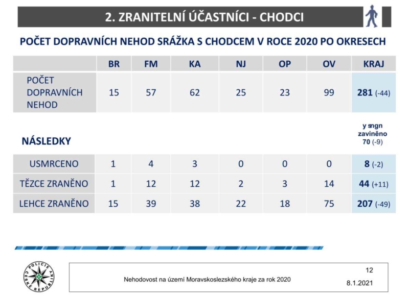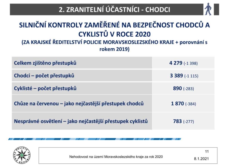Ze statistických ukazatelů roku 2020 vyplývá, že na našich silnicích zemřelo v roce 2020 o 15 osob méně (38), než tomu bylo v roce uplynulém (53). Pokles se projevil také u lehce zraněných osob (-369) a nehod, kdy byl viník pod vlivem alkoholu (-8) a drog (-5). Nárůst o čtyři byl u těžce zraněných osob (154).