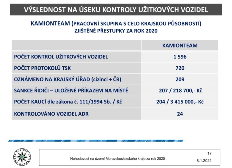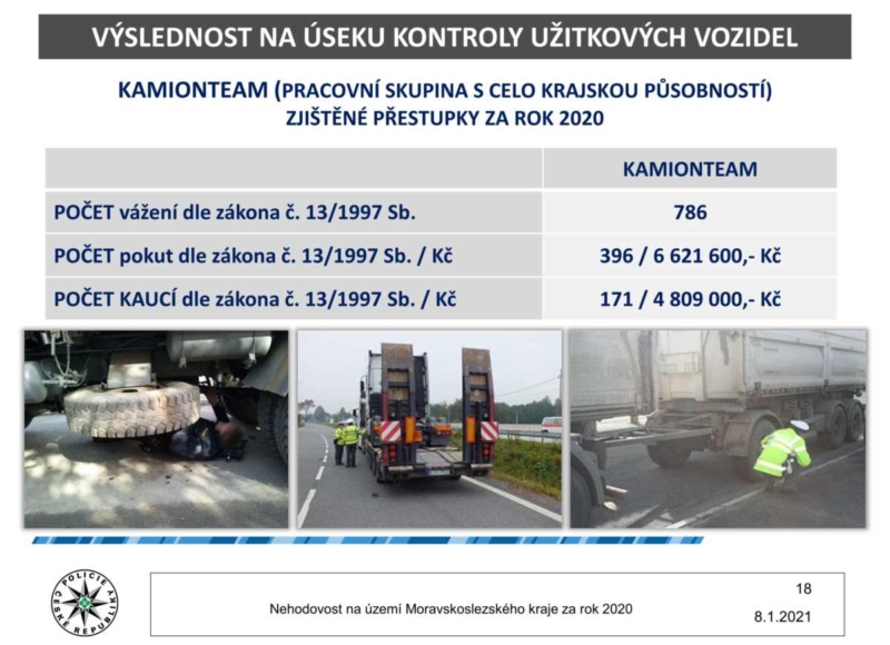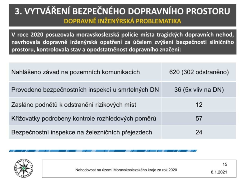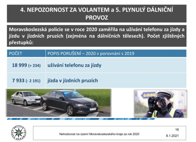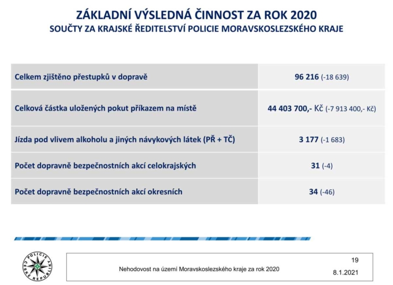 Co se týká činnosti moravskoslezských policistů, kromě běžného výkonu služby, realizovali v průběhu roku také přes šest desítek dopravně-bezpečnostních akcích, při kterých zjistili 96 216 přestupků a celkem uložili příkazem na místě částku přesahující 44 milionů korun. Při silničních kontrolách bylo 3 177 řidičů pod vlivem návykových látek. Dále bez jednoho v 19 tisících případech telefonovali řidiči za jízdy, což je o 234 případů více, než v roce 2019.