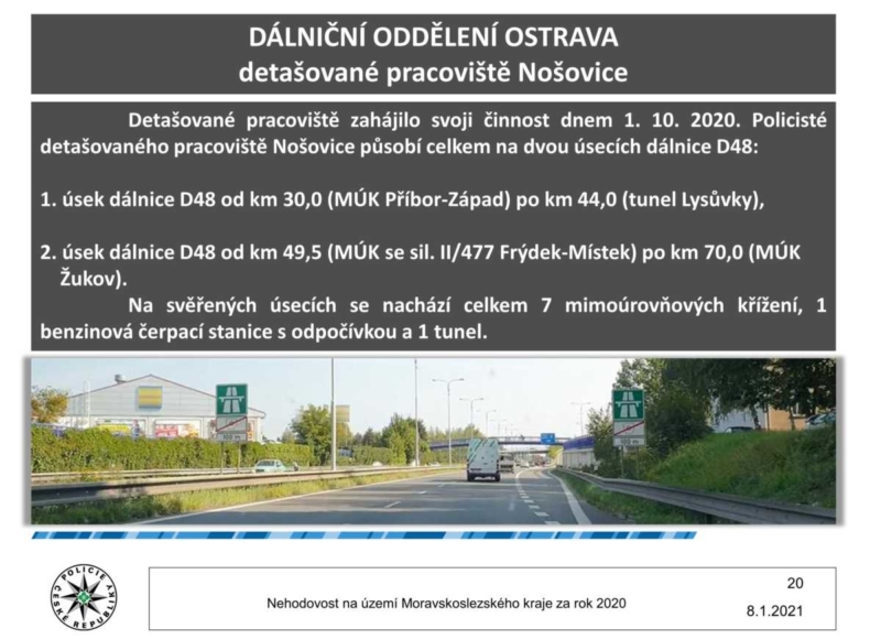 Od října 2020 zahájilo provoz detašované pracoviště Dálničního oddělení Ostrava se sídlem v Nošovicích. Policisté monitorují provoz na dálnici D48.