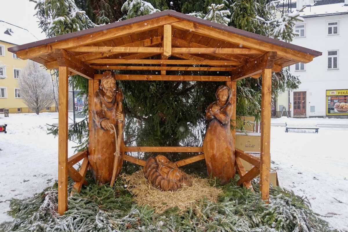 Nový vyřezávaný betlém zdobí náměstí Míru v Rýmařově
