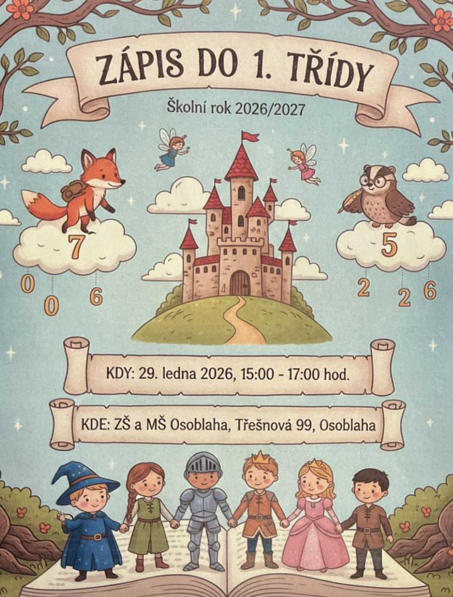 OSOBLAHA | Základní škola Osoblaha informuje o konání zápisu do 1. třídy pro školní rok 2025/2026. Akce proběhne ve středu 29. ledna od 15:00 do 17:00 hodin. Rodiče i jejich budoucí prvňáčci budou mít příležitost projít si školu, poznat pedagogy a získat základní informace o nástupu do prvního ročníku.
