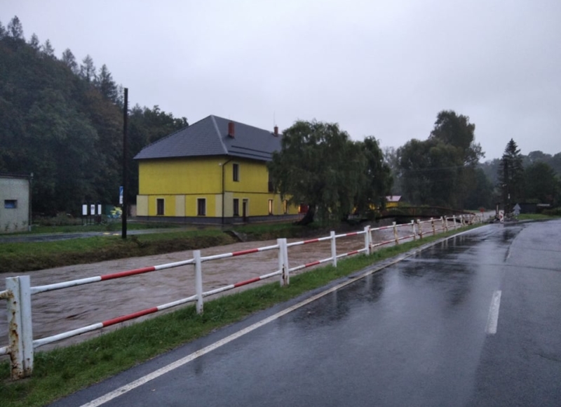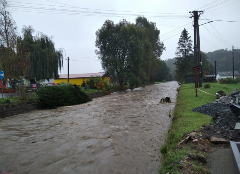 DÍVČÍ HRAD (FOTO) | Vydatné noční deště zvedly hladiny řek na Osoblažsku. Řeka Osoblaha v Dívčím Hradě dosáhla ráno ve středu 14. října 2020 druhého povodňového stupně.