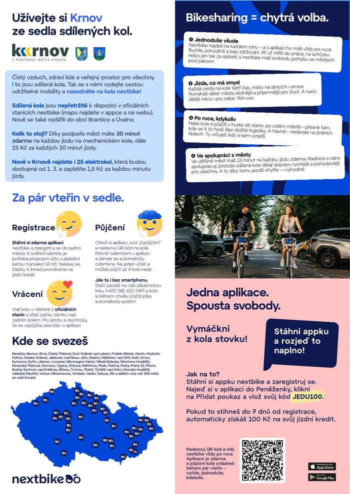 KRNOV | Od ledna 2026 zajistí bikesharing v Krnově opět společnost nextbike Czech Republic. Obyvatelé se mohou těšit na rozšířenou síť stanic, zapojení okolních obcí i novinku v podobě elektrokol. Sdílená kola se tak stanou ještě dostupnější a pohodlnější součástí městské dopravy.