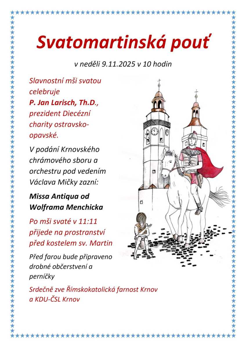 KRNOV | Svatý Martin dorazí do Krnova na bílém koni v neděli 9. listopadu, kdy bude po poutní mši slavnostně přivítán před farním kostelem. Oblíbená tradice každoročně přiláká stovky návštěvníků, kteří si připomínají legendu o vojákovi, jenž se rozdělil o plášť s promrzlým žebrákem a později se stal biskupem i patronem jezdců, koní a vinařů.