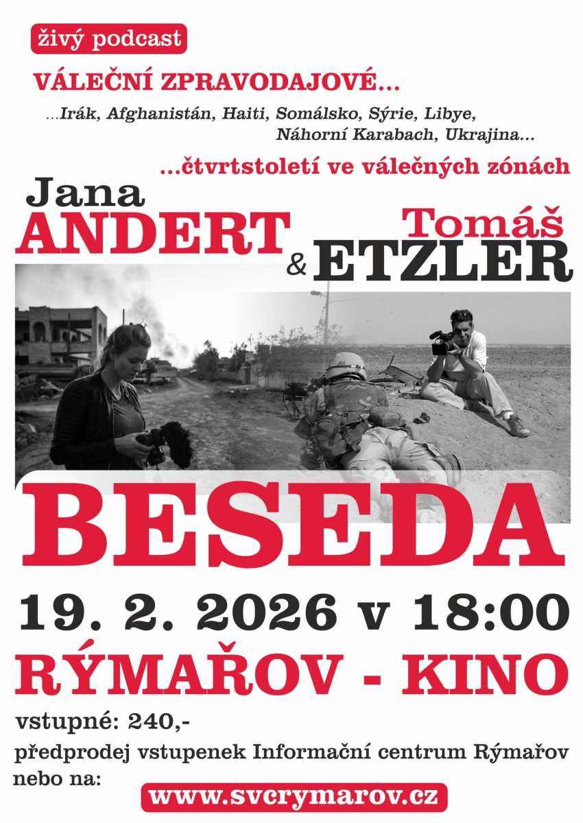 RÝMAŘOV | Jaké to je stát uprostřed konfliktu, kde každé rozhodnutí může být poslední? Co obnáší práce novináře, který přináší svědectví z míst, kde jde o život – a jaké příběhy se do televizních zpráv nikdy nedostanou? O své zkušenosti, morální dilemata i silné momenty se v Rýmařově podělí bývalí váleční zpravodajové Jana Andert a Tomáš Etzler na besedě pořádané Jazzclubem SVČ Rýmařov. Pokud hledáte autentický pohled do reality světových konfliktů, tohle setkání vás zasáhne i obohatí.