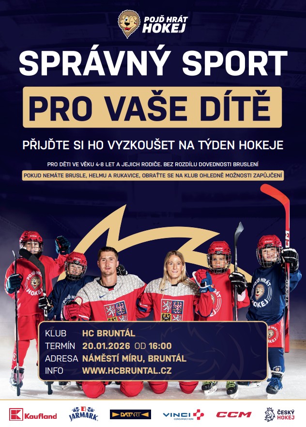 BRUNTÁL | V úterý 20. ledna od 16 hodin čeká na děti ve věku 4 až 8 let jedinečná příležitost stát se na chvíli hokejistou či hokejistkou. HC Bruntál ve spolupráci s Českým hokejem pořádá na náměstí Míru náborovou akci v rámci Týdne hokeje, kde si malí sportovci mohou zdarma vyzkoušet bruslení, užít si zábavný program a odnést si domů hokejový dárek.