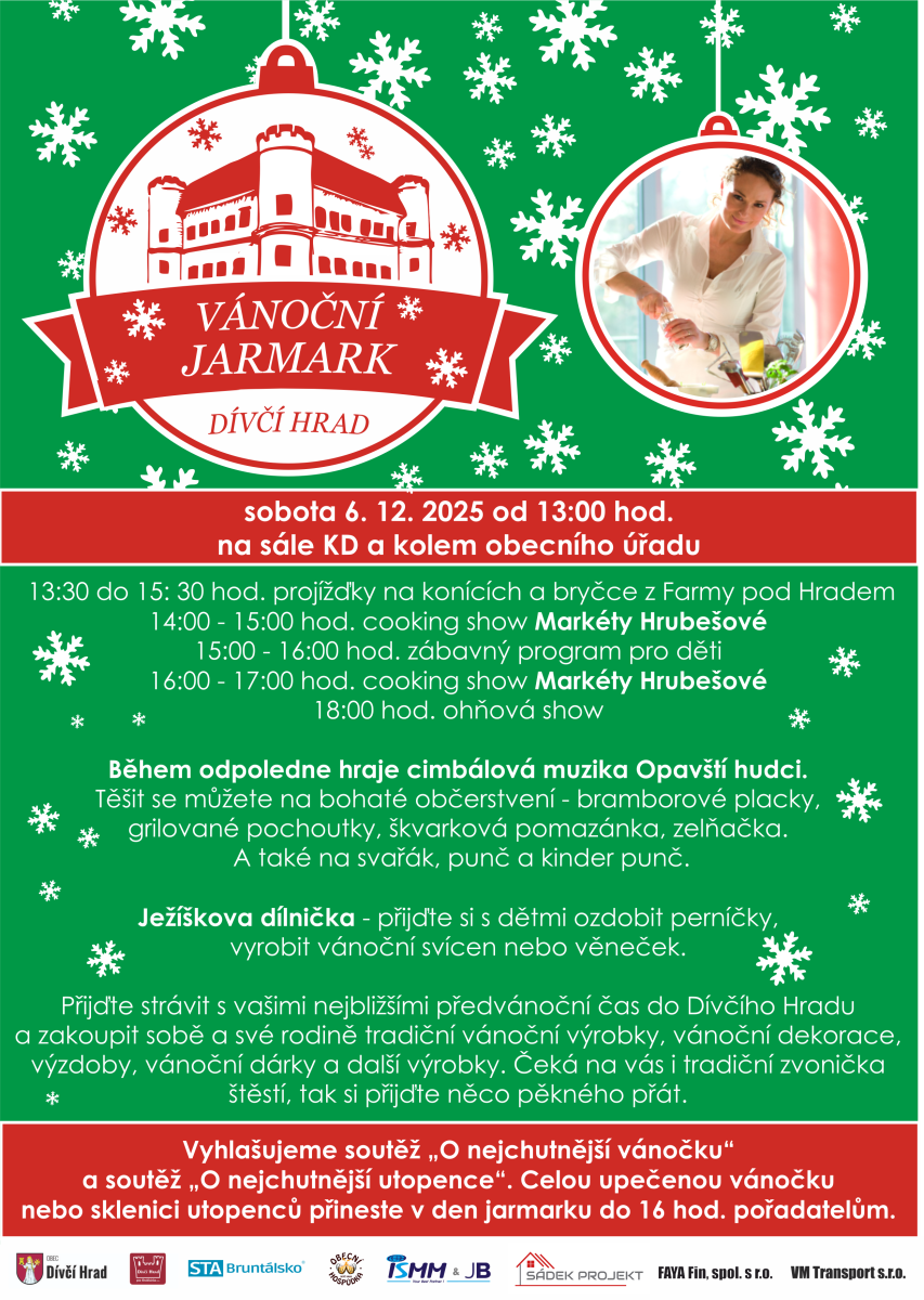 DÍVČÍ HRAD | Nechte se vtáhnout do kouzelné adventní atmosféry! V sobotu 6. prosince od 13 hodin ožije Dívčí Hrad vůněmi perníčků, tóny cimbálové muziky a radostným tvořením v Ježíškově dílničce. Vrcholem dne bude cooking show oblíbené herečky Markéty Hrubešové, která vás inspiruje svátečními recepty hned dvakrát. A až se setmí, čeká vás ohňová show, která rozzáří večerní oblohu. Přijďte s rodinou či přáteli – čeká vás den plný chutí, hudby, smíchu a překvapení, který si nenechte ujít!