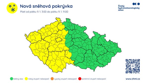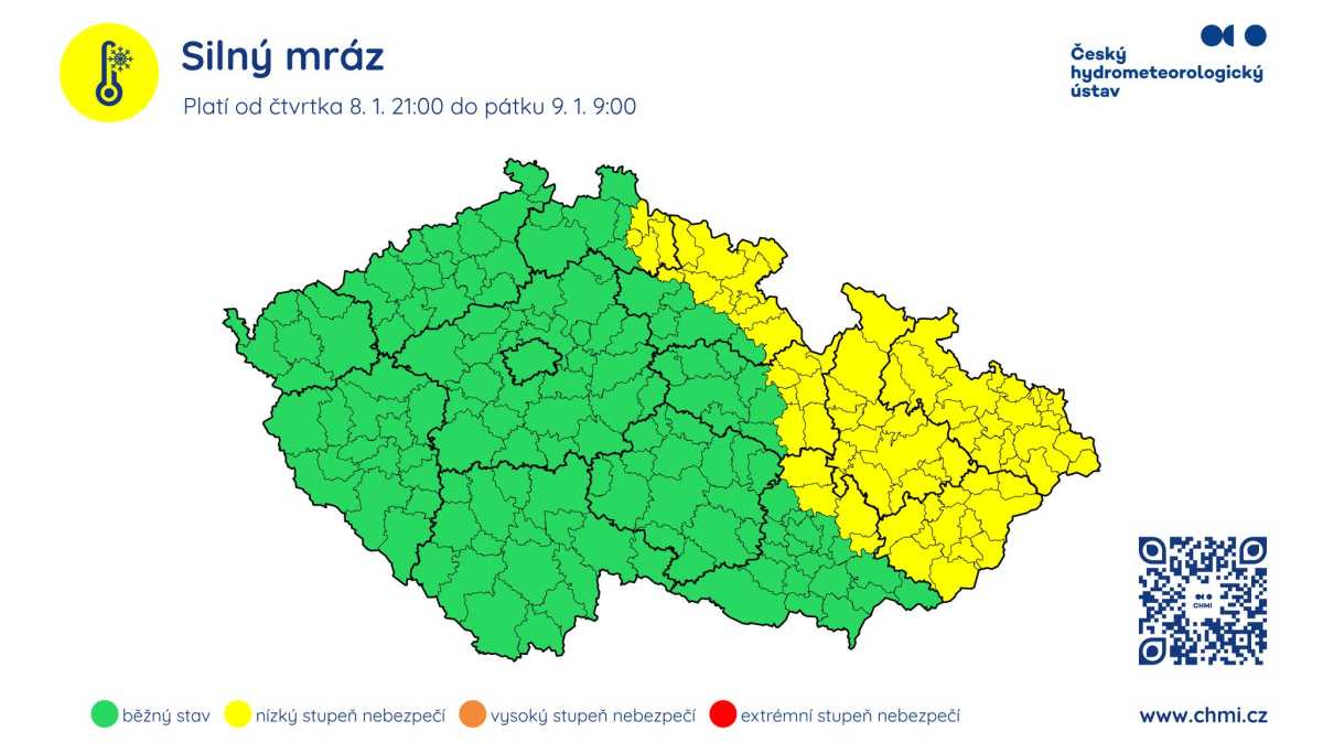 V noci na pátek se zároveň očekávají silné mrazy. Na severovýchodě, východě území a na střední Moravě mohou teploty klesat pod –12 °C, v nejchladnějších místech až k –15 °C. Při déletrvající zmenšené oblačnosti mohou podobně nízké teploty ojediněle nastat i v dalších částech republiky.