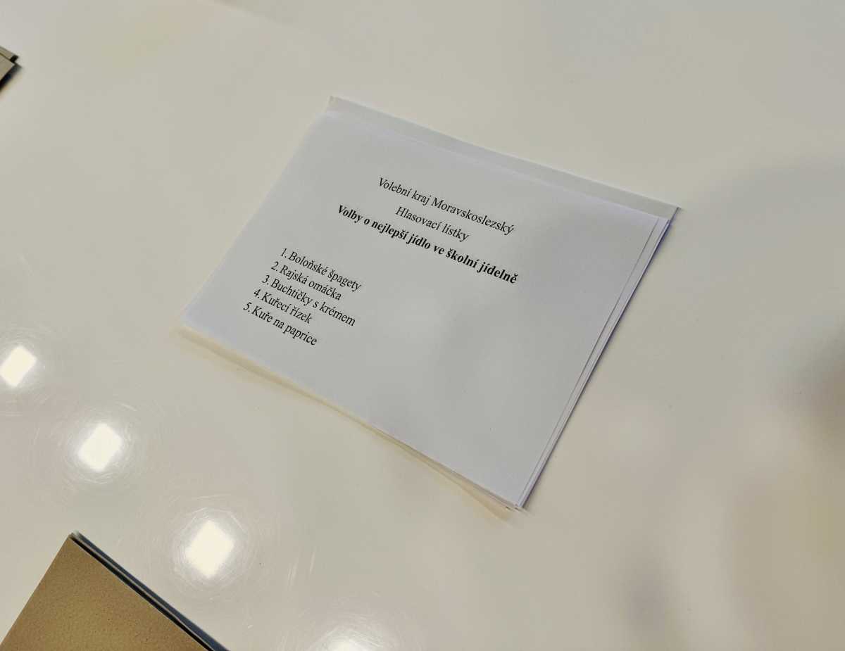 Žáci si průkazy totožnosti vyrobili už předem ve škole. Do volební místnosti pak dorazilo celkem dvacet dětí z 5. A a 5. B spolu s paní učitelkou a asistentkami. Tématem voleb bylo školní stravování – děti volily dvě jídla, která jsou ve školní jídelně nejlepší. Po sečtení hlasů zvítězily boloňské špagety.