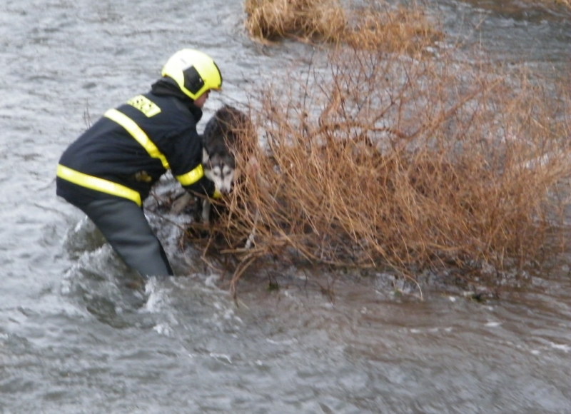 Bezradného psa huskyho uprostřed vodního toku ohlásil svědek na tísňovou linku hasičů na Nový rok v osm hodin ráno. Do Nábřežní ulice vyjela jednotka Hasičského záchranného sboru Moravskoslezského kraje ze stanice Krnov a také místní jednotka dobrovolných hasičů z Města Albrechtic.